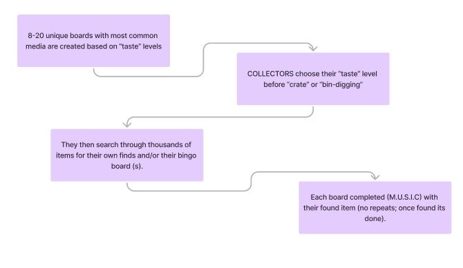 User flows were determined using purchasing trend data on Discogs.com where users trade and keep track of their collections. Ideation stage idea: users will pick from a community collection of boards or generate them randomly based on their taste preferences or taste-level based on current collection.
